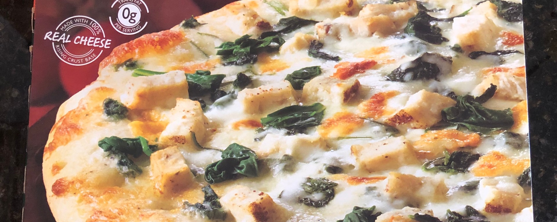 It is a chicken and spinach pizza with a creamy garlic sauce, so pretty much a white pizza. I decided to bake it for lunch in between cleaning the house and let me tell you. It was really good. I was surprised. The crust underneath was nice and crispy, the edges were golden brown and the top was bubbling like a real pizza from a pizza place. We each had two slices and saved the rest. I was really surprised. I couldn’t believe it was frozen pizza. I would say its pretty comparable to a pizza place pizza.